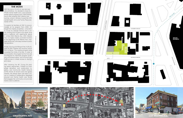 All the communal program of the facility were housed in a 2 story corrugated red brick volume along the street, with its activities highlighted to the street with picture windows of various sizes. To facilitate informal social meetings, we made nolli plans and designed the circulation with sunlit interior plazas and hang out spaces. Additionally, to connect to the community, we proposed the communal facilities of the mental health clinic (art room, cafeteria, group clinic rooms, garden, etc)... be available for use by the community after hours for such activities as farmer's markets, afterschool, community meetings, etc.... Using corbusier's le modulor system, all the elevation and sectional datums are related to the human body to enhance the connection between the human body and the building. This mental health building was quite different than the mental health facilities like Bellevue Hospital in the city, where patients are hidden from society, and tucked away.