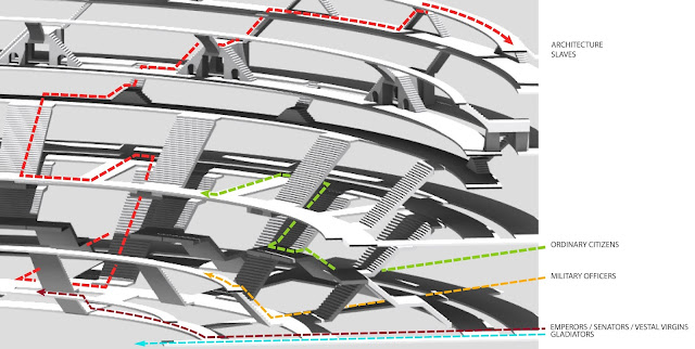 The final application is still in flux, but the academic research I’ll be presenting focuses on brontosaurus shaped stairs, and articulating how Romans reinforced their class structure through circulation: the gladiators got the glory and direct entry to the arena, the emperors and senators got the best view, the military got to protect the leaders, the citizens were stuck in the middle, and the architects got the longest promenade.